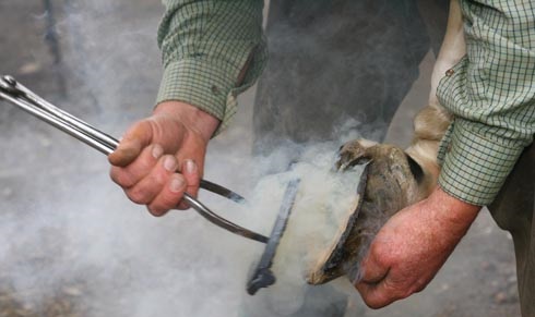 “Hot shoeing,” also called “hot setting” or “hot fitting,” is a common practice among farriers. After the foot has been trimmed, rasped and is ready for the new shoe, the farrier will heat the shoe in the forge and place it briefly on the foot to sear the path where the shoe will ultimately lie.